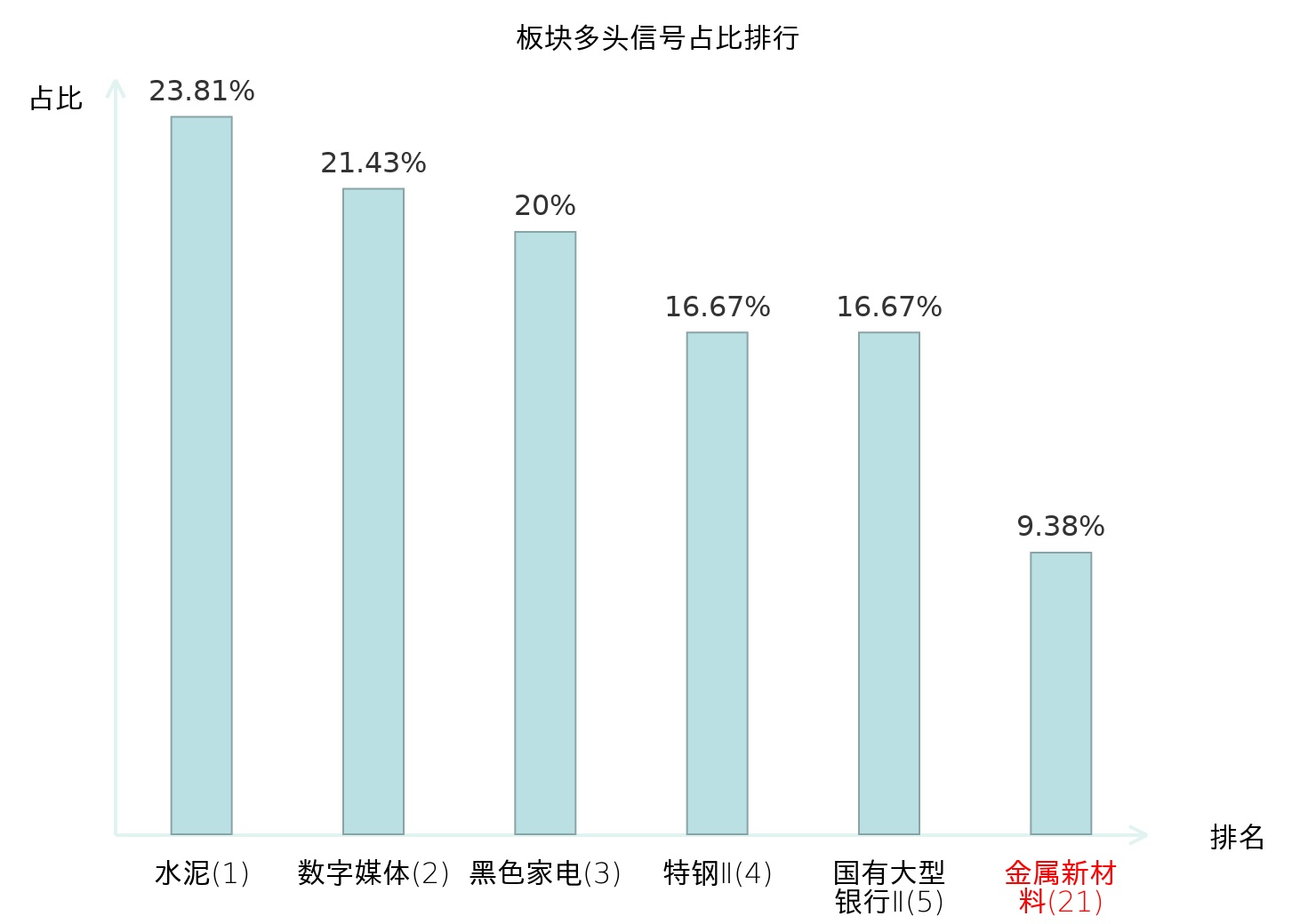 全市场所有行业板块中主力多头信号占比排名中,水泥板块位居第一。焦炭Ⅱ板块名次提升最快,较昨日上升115位。