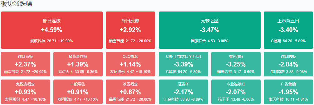 板块方面,冰雪产业、文创玩具、文化传媒、旅游酒店等板块涨幅居前;,贵金属、房地产、煤炭、多元金融等方向跌幅居前。