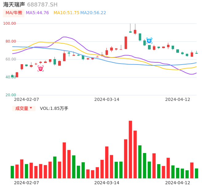 04月12日,海天瑞声收报66.40,股价涨幅-1.63%,成交金额1.26亿元,换手率4.49%。
