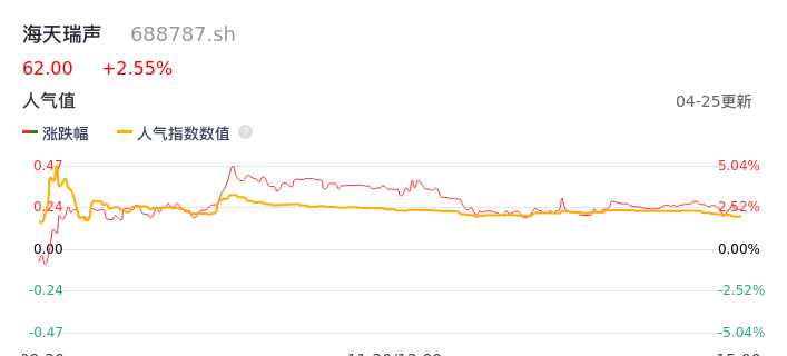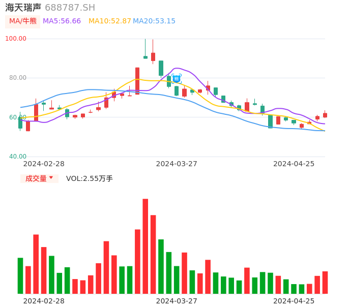04月25日,海天瑞声收报62.00,股价涨幅2.55%,成交金额1.58亿元,换手率6.17%。
