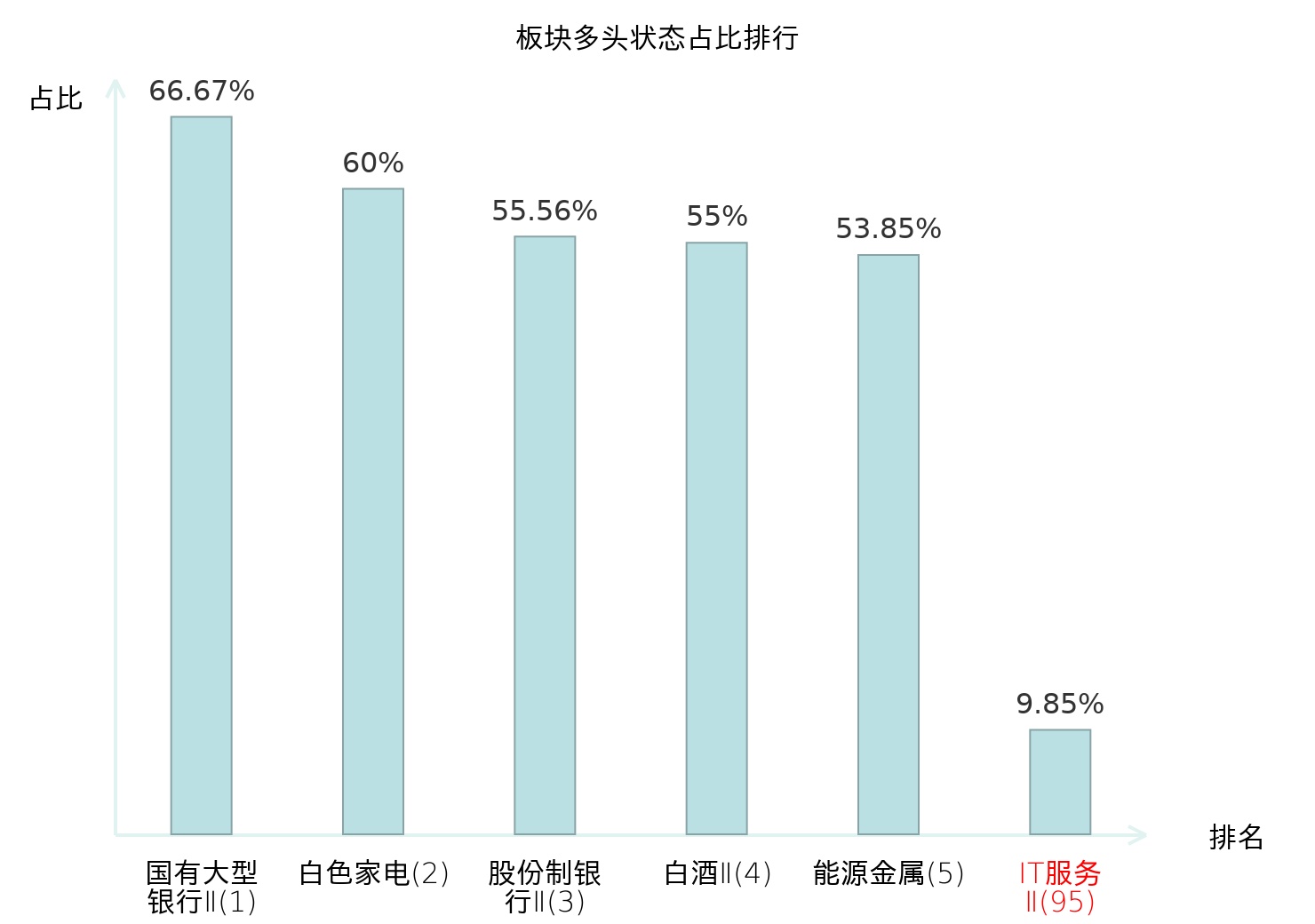 全市场所有行业板块中主力多头状态占比排名中,国有大型银行Ⅱ板块位居第一。林业Ⅱ板块名次提升最快,较昨日上升99位。