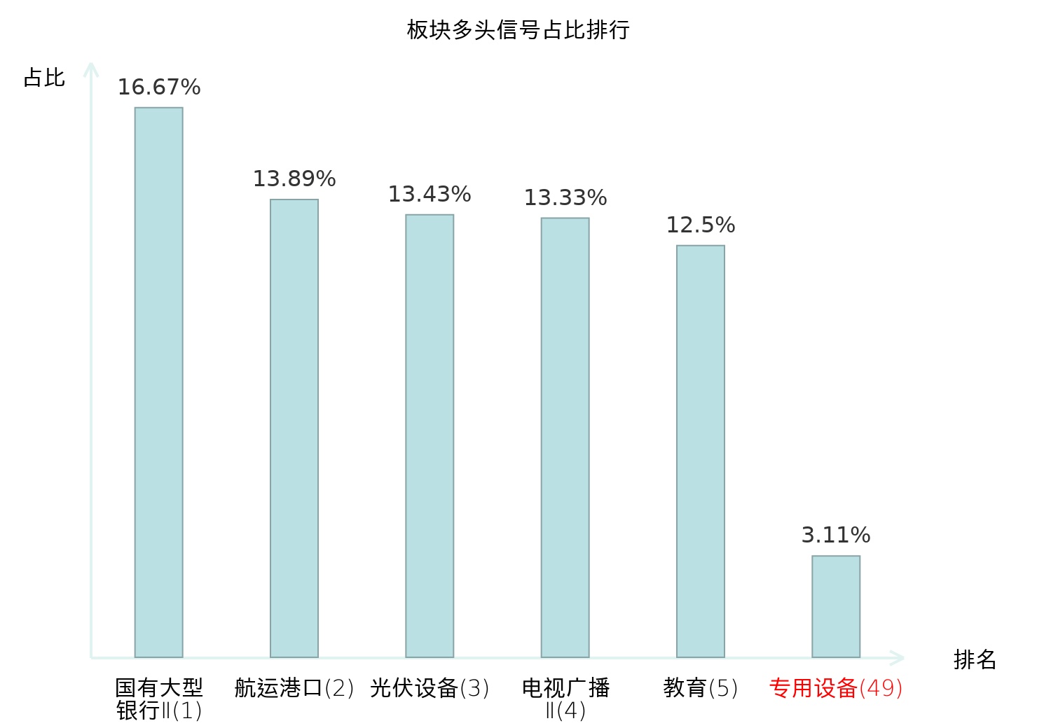 全市场所有行业板块中主力多头信号占比排名中,国有大型银行Ⅱ板块位居第一。国有大型银行Ⅱ板块名次提升最快,较昨日上升124位。