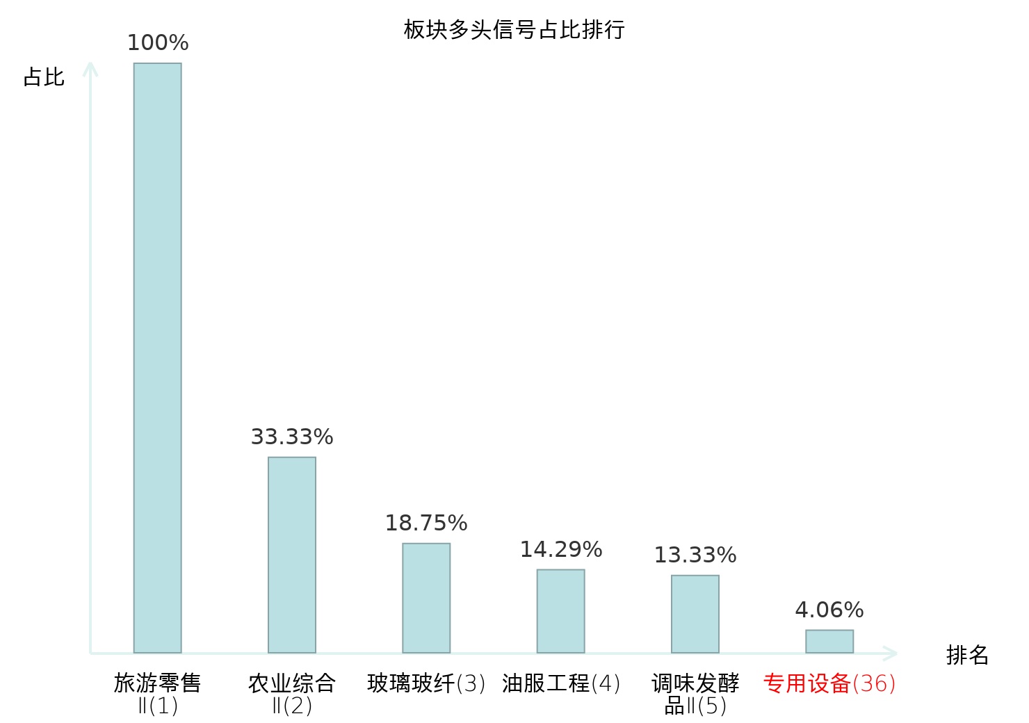 全市场所有行业板块中主力多头信号占比排名中,旅游零售Ⅱ板块位居第一。旅游零售Ⅱ板块名次提升最快,较昨日上升130位。