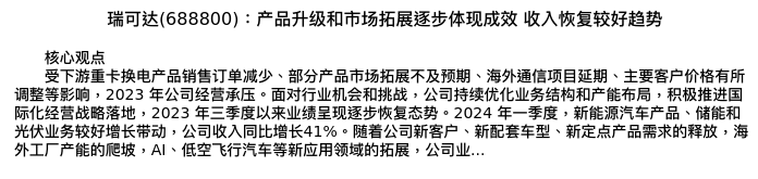 值得注意的是:2024年05月中信建投证券的刘永旭/阎贵成/武超则/汪洁分析师,首次发布关于瑞可达的研究报告,标题为:瑞可达(688800):产品升级和市场拓展逐步体现成效 收入恢复较好趋势。