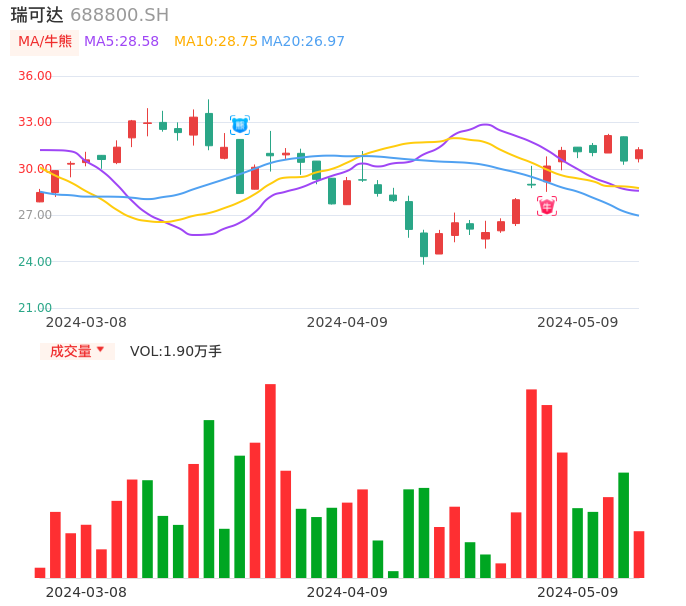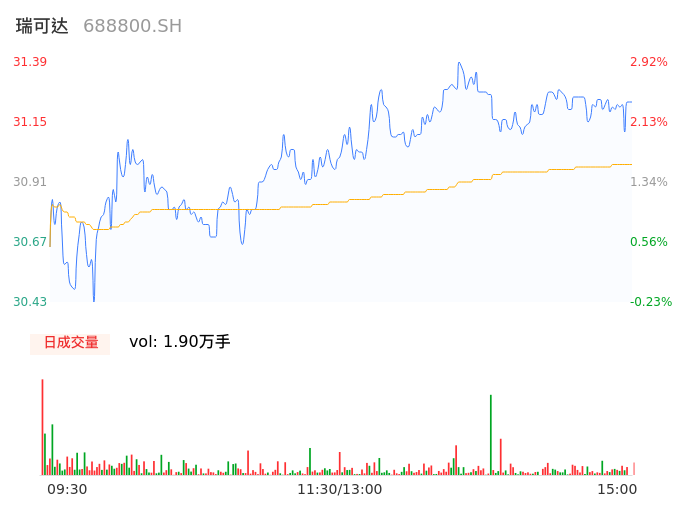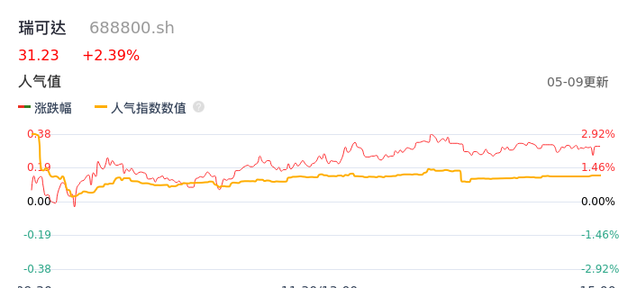 05月09日,瑞可达收报31.23,股价涨幅2.39%,成交金额5884.87万元,换手率1.78%。