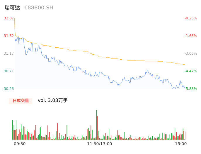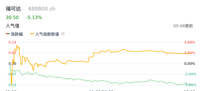 05月08日,瑞可达收报30.50,股价涨幅-5.13%,成交金额9344.15万元,换手率2.84%。
