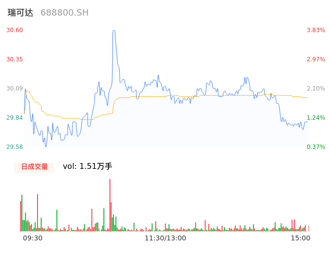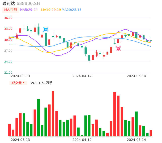 05月14日,瑞可达收报29.80,股价涨幅1.12%,成交金额4517.02万元,换手率1.41%。