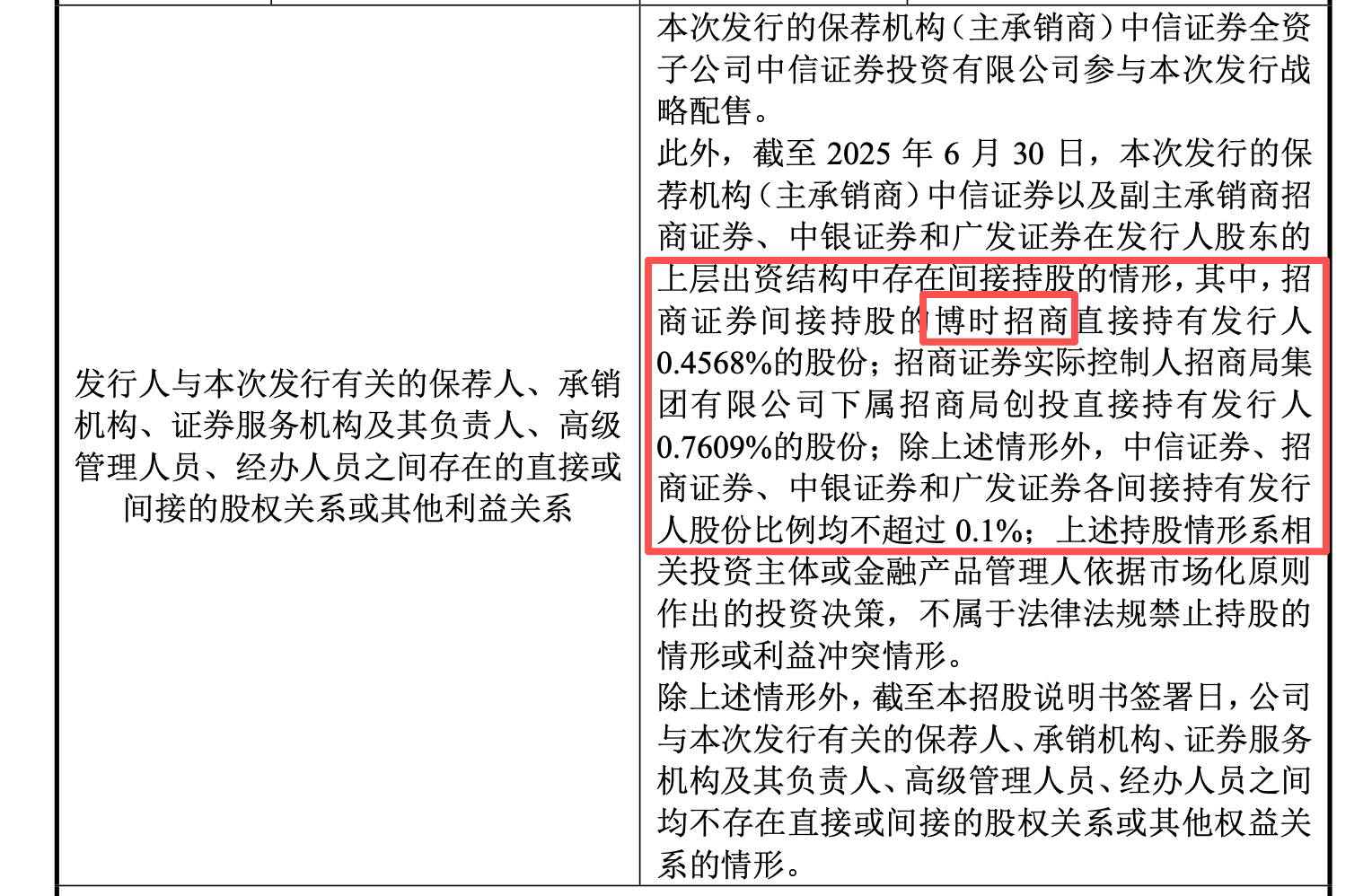 “海南博时创新管理有限公司”由博时基金100%控股,穿透后由招商证券持股49%。根据招股说明书描述,招商证券间接持股的博时招商直接持有发行人0.4568%的股份。
