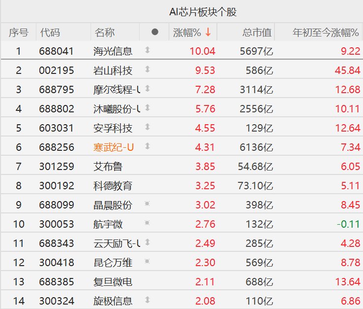 A股异动丨AI芯片股走强,海光信息涨超10%,沐曦股份涨超5%,寒武纪涨超4%