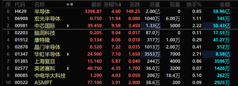 中芯国际的走强,带动了整个板块。上午接近收盘时段,A股半导体直线拉升,半导体ETF一度拉升近3%,并带动了科创板指数走强。港股半导体板块大涨近5%,宏光半导体涨幅接近12%,脑洞科技、华虹半导体、上海复旦等大幅走强。