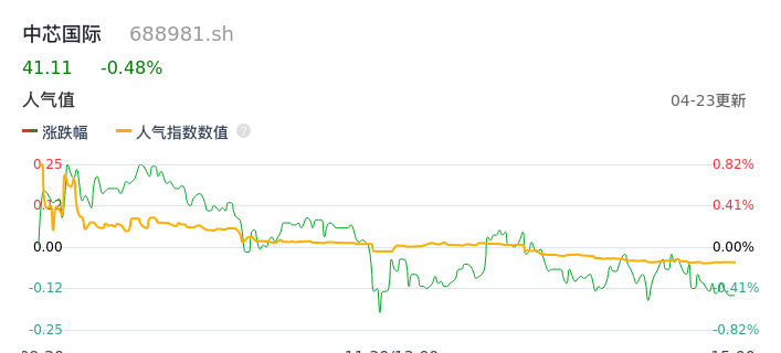 04月23日,中芯国际收报41.11,股价涨幅-0.48%,成交金额4.55亿元,换手率0.56%。