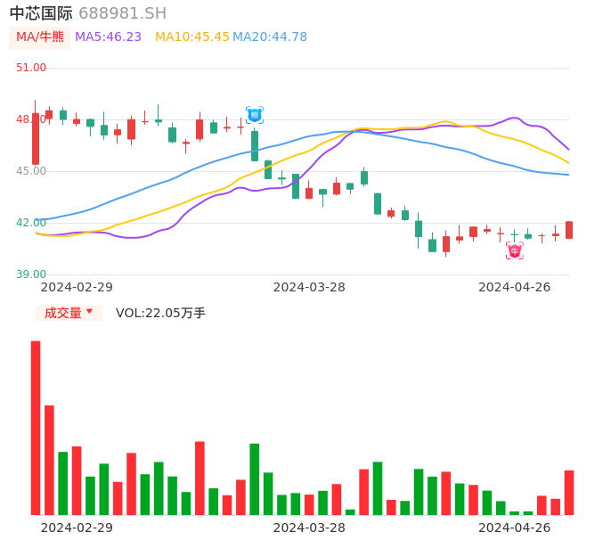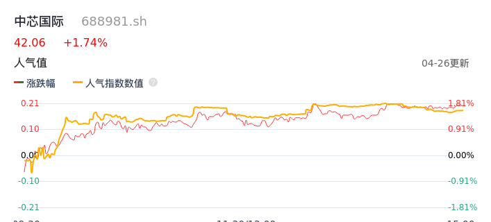 04月26日,中芯国际收报42.06,股价涨幅1.74%,成交金额9.22亿元,换手率1.12%。