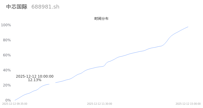 688981中芯国际2025年12月12日成交58.50万手,成交金额67.35亿,相较昨日放量28.19万手,换手率2.93%,成交清淡。