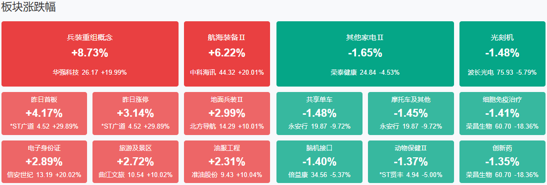 板块方面,军工装备、跨境支付、银行、油气等板块涨幅居前,光刻机、脑机接口、创新药、半导体等板块跌幅居前。截至收盘,沪指跌0.22%,深成指跌0.48%,创业板指跌0.66%。