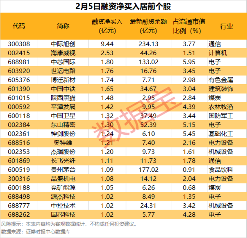 中际旭创融资净买入额居首,当日净买入9.44亿元;其次是海康威视、中芯国际,融资净买入金额分别为2.53亿元、1.80亿元。融资净买入金额居前的还有世运电路、博迁新材、中国中铁等。