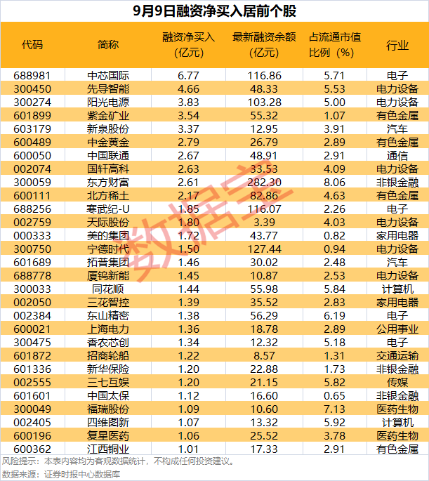 具体到个股,9月9日获融资净买入千万元以上的有495只,其中29只融资净买入额超1亿元。中芯国际融资净买入额居首,当日净买入6.77亿元;其次是先导智能、阳光电源,融资净买入金额分别为4.66亿元、3.83亿元;融资净买入金额居前的还有紫金矿业、新泉股份、中金黄金等。