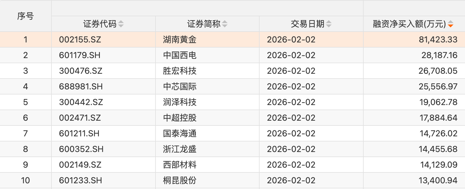 个股方面,23只个股获融资净买入额超1亿元。湖南黄金获融资净买入额居首,净买入8.14亿元;融资净买入额居前的还有中国西电、胜宏科技、中芯国际、润泽科技、中超控股、国泰海通、浙江龙盛、西部材料、桐昆股份。