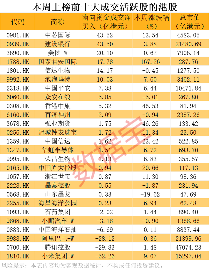 本周南向资金净流入中芯国际、美团-W,净卖出小米集团-W、腾讯控股、阿里巴巴-W。