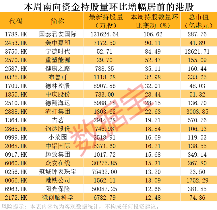 从持股量变化来看,本周23股的南向资金持股量环比增长超10%,其中国泰君安国际持股量环比实现翻倍,增幅为106.62%,美中嘉和、宁德时代的持股量增幅均在80%以上。