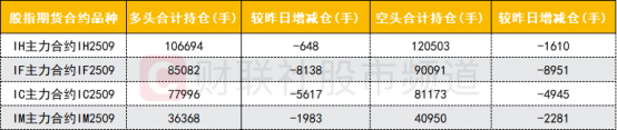 四大期指主力合约中,IH、IF、IC、IM合约多空双方均减仓,IF、IC合约多头和空头减仓数量均较多。IH合约空头减仓数量(大于)多头减仓数量。