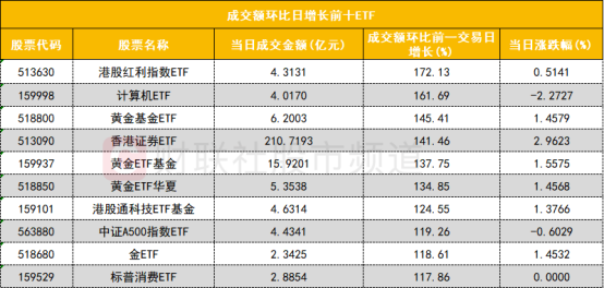从成交额环比增长前十的ETF来看,港股红利指数ETF(513630)成交额环比增长172%,位居首位。;计算机ETF(159998)成交额环比增长161%位居次席。
