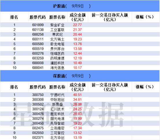 从沪股通前十大成交个股来看,紫金矿业位居首位;工业富联和寒武纪分居二、三位。