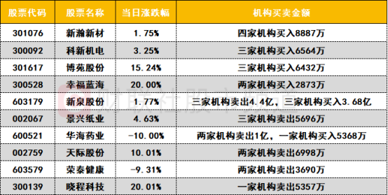 今日龙虎榜机构活跃度明显降低,买入方面,机器人概念股新瀚新材获机构买入8887万,科新机电获机构买入6564万。