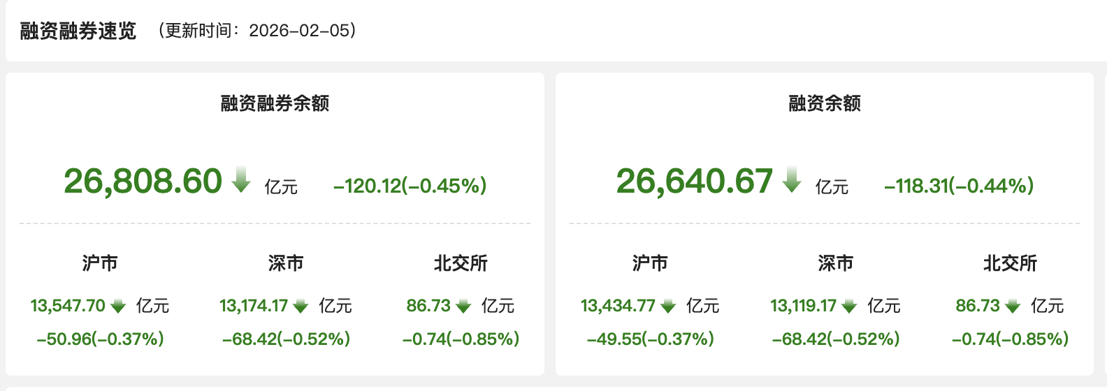上证报中国证券网讯2月5日,A股两融余额为26808.60亿元,较上一交易日减少120.12亿元,占A股流通市值比例为2.62%。当日两融交易额为1993.51亿元,较上一交易日减少260.13亿元,占A股成交额的9.08%。