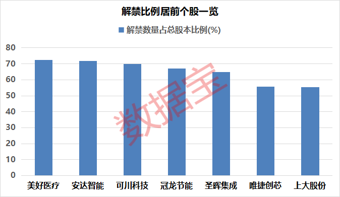 从解禁比例来看,美好医疗、安达智能、可川科技、冠龙节能等7股的解禁比例居前,均超50%。