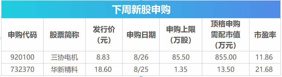 Wind数据显示,下周将有2只新股发行,三协电机将于8月26日发行,申购代码为920100;华新精科将于8月25日发行,申购代码为732370。