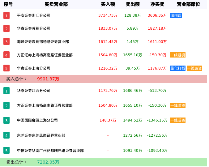 上榜的前五大营业部合计成交1.71亿元,买入金额前五名营业部合计买入0.99亿元,卖出金额前五名营业部合计卖出0.72亿元。