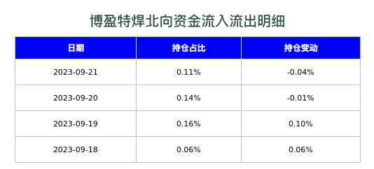 博盈特焊今日北向资金净流出39.38万,仓位减少