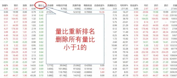 2,将加入自选或新板块的股票在用量比重新排名,删除所有量比小于1的,没有放量的股票不建议操作。
