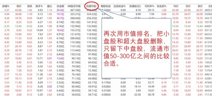 4,再用市值排名,把小盘股和超大盘股删除,只留下中盘股,流通市值50-300亿之间的比较合适。