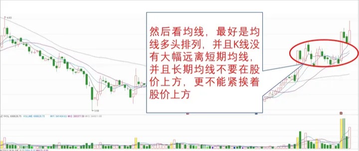 6,然后看均线,最好是均线多头排列,并且K线没有大幅远离短期均线,并且长期均线不要在股价上方,更不能紧挨着股价上方。