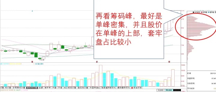 7,剩下的再看筹码峰,最好是单峰密集,并且股价在单峰的上部,套牢盘占比较小。