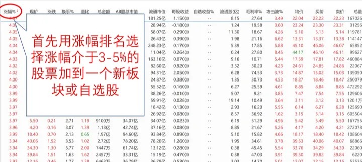 1,下午两点过后就要准备选股,先观察大盘情况,如果大盘表现不错,则在两点半开始选股,首先点击涨幅排行榜,选择涨幅介于3-5%的股票加到一个新板块或自选股。