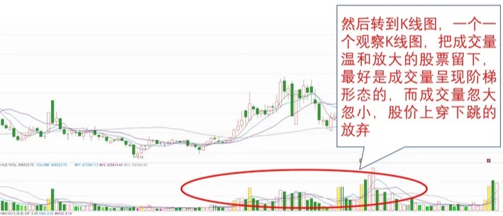 5,然后转到K线图,把成交量温和放大的股票留下,最好是成交量呈现阶梯形态的,而成交量忽大忽小,股价上穿下跳的放弃。