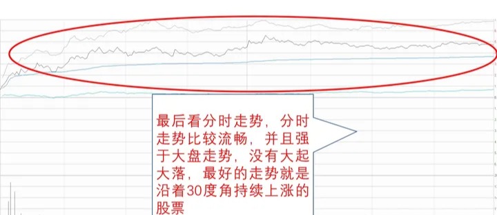 最好的走势就是沿着30度角持续上涨的股票,次日的冲高会更加的有力度。如果分时走势很乱,或者是尾盘急拉的话也要放弃。