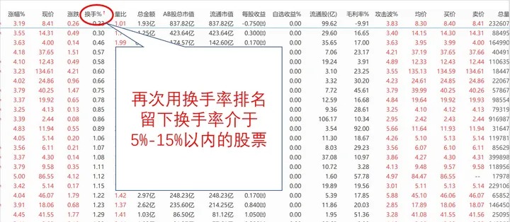 3,用换手率排名,留下换手率介于5%-15%以内的股票。