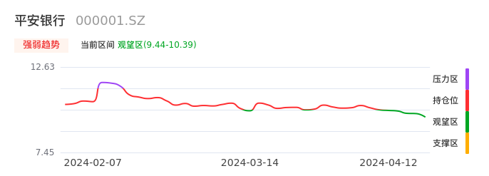 我们来看一下该股的九方特色指标强弱趋势的情况:平安银行自04月03日从持仓区下穿到观望区,股价近期持续走弱。短期已经进入空头行情,且下跌动能仍未衰竭。建议继续谨慎观望。