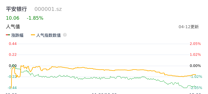 04月12日,平安银行收报10.06,股价涨幅-1.85%,成交金额13.22亿元,换手率0.67%。