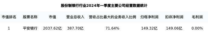 平安银行最新报告期数据为一季度,下表汇总了股份制银行行业内市值靠前的公司一季度主要经营数据