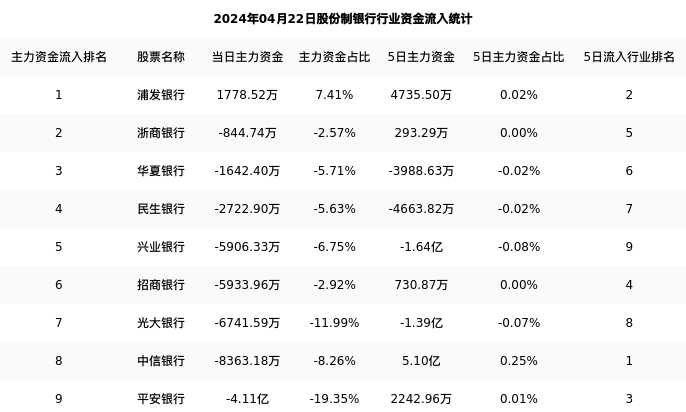 平安银行今日净流出4.11亿元,主力占比19.35%,在行业内排名:9/9;5日净流入2242.96万元,主力占比0.01%,在行业内排名:3/9。