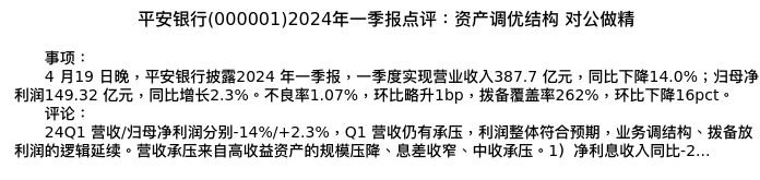 值得注意的是:2024年04月华创证券的贾靖/徐康分析师,首次发布关于平安银行的研究报告,标题为:平安银行(000001)2024年一季报点评:资产调优结构 对公做精。