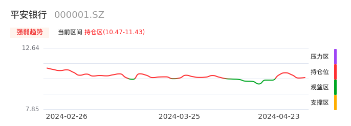 我们来看一下该股的九方特色指标强弱趋势的情况:平安银行自04月17日从观望区上穿到持仓区。股价近期在多头区域持续强势上扬,上升动能仍较为充足,可积极关注。后续重点关注上方压力位:11.43元是否能突破上攻。