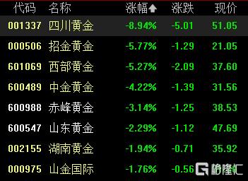 贵金属股走低,四川黄金跌超8%,招金黄金、西部黄金、中金黄金跌超4%,赤峰黄金、山东黄金等跟跌。