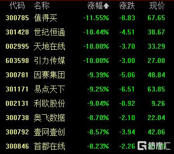 快手概念跌幅居前,值得买跌超11%,天地在线、引力传媒跌停,因赛集团、易点天下跌超9%。