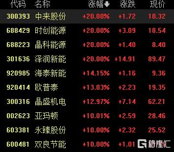 光伏股集体强势,中来股份、时创能源、晶科能源、泽润新能20cm涨停,海泰新能涨超14%,欧普泰涨超13%。
