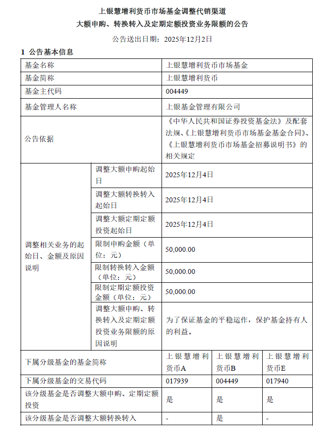 另一方面,限额调整陷入“收紧-放松-再收紧”的高频震荡。以上述的上银慧增利货币为例,该基金在12月2日至16日的半个月内实施了5次限额调整,额度在5万元与50万元之间反复切换,最终于16日再次收紧至5万元。